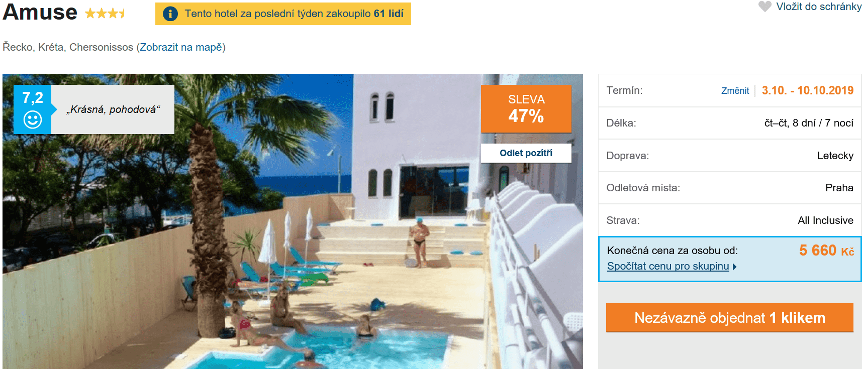 Jestliže byste rádi utekli před chladným podzimem do teplých krajů, nenechte si ujít akční nabídku cestovní kanceláře, se kterou se můžete vydat na krásnou Krétu. V ceně 5660 Kč máte zpáteční letenku z Prahy, dopravu na místě, služby delegáta, ubytování a stravování formou All Inclusive po celých 8 dní. Více informací o cestování po Krétě naleznete v našem podrobném průvodci.