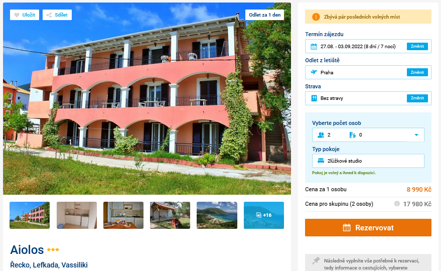 Právě vám začala dovolená a hledáte vhodný Last Minute? Potom by se vám mohla líbit nabídka cestovní kanceláře na pobyt v Řecku. Podívat se můžete na krásnou Lefkádu a to jen za 8 990 Kč. V ceně je ubytování v hotelu na 8 dní, zpáteční letenky s odletem z Prahy, letištní transfery a služby delegáta. Zájezd je bez stravy, máte tak naprostou volnost v plánování výletů. Rozhodně doporučujeme navštívit i vyhlášené řecké taverny. Před odletem určitě nakoukněte do našeho online průvodce Lefkadou, ve kterém najdete informace o ostrově a tipy na výlety. S nákupem nečekejte, zbývá posledních pár volných míst!