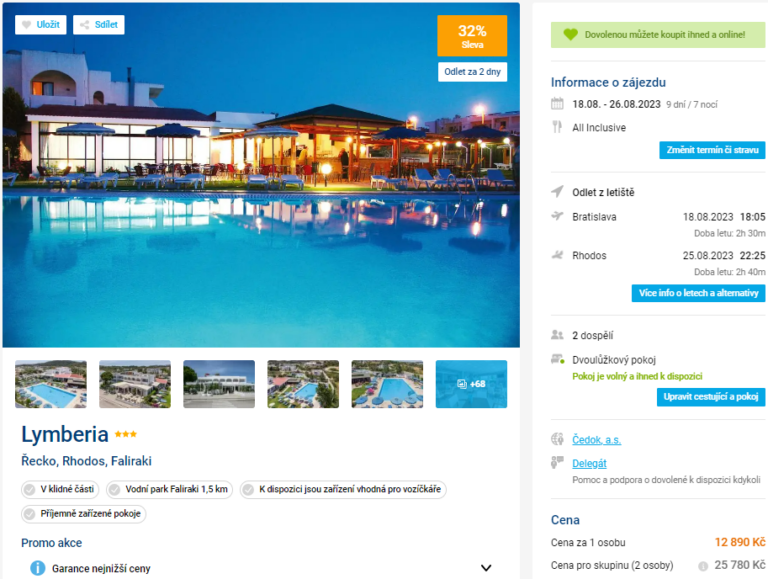 Pokud vás láká některý z řeckých ostrovů, pak možná oceníte tip na dovolenou na Rhodosu. Můžete se tam podívat za cenu 12890 Kč za osobu (komplet balíček: letenky, delegát, doprava z a na letiště a ubytování na 7 nocí se stravou All Inclusive). Hotel se nachází v klidnější části letoviska, cca 800 metrů od centra a 500 metrů od pláže. Nedaleko najdete také vodní park Faliraki (1,5 km). Pro více tipů nahlédněte do našeho průvodce.