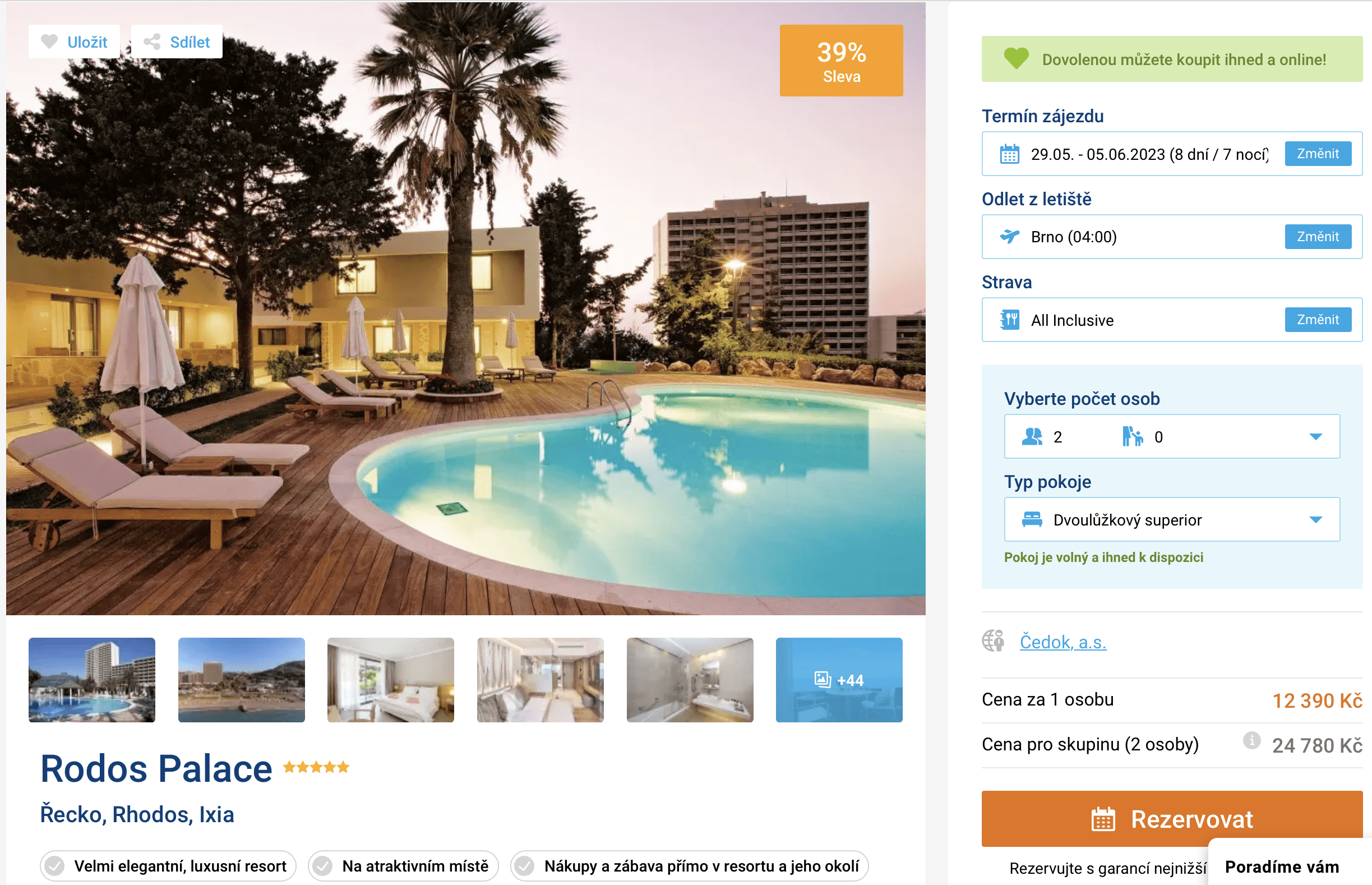 Pokud vás láká řecký ostrov Rhodos a letiště v Brně nemáte daleko, mohl by vám padnout do oka náš dnešní tip. Zájezd do 5* resortu Rodos Palace v letovisku Ixia můžete aktuálně pořídit za cenu 12 390 Kč. V té jsou zahrnuty letenky (odlet z Brna), letištní transfery v místě, ubytování na 8 dní, all inclusive stravování a služby delegáta. Hotelový komplex je situován nedaleko centra letoviska. Dlouhá písčitá pláž je od hotelu vzdálena asi 50 metrů. Před cestou určitě nakoukněte do našeho podrobného průvodce ostrovem, ve kterém najdete tipy na výlety i nejkrásnější pláže ostrova.