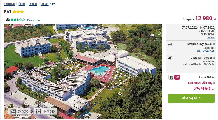 Užijte si parádní dovolenou na Rhodosu! V nabídce cestovní kanceláře se totiž objevil organizovaný zájezd na Rhodos, který navíc nezruinuje vaší peněženku. Za cenu 12 980 Kč pořídíte ubytování v hotelu na 8 dní, program All Inclusive, zpáteční letenky z Ostravy, letištní transfery a služby delegáta. Odlet je až 7.7.2022, máte tak ještě dostatek času si vše zorganizovat. Rady a tipy pro váš itinerář můžete načerpat v našem online průvodci Rhodosem.