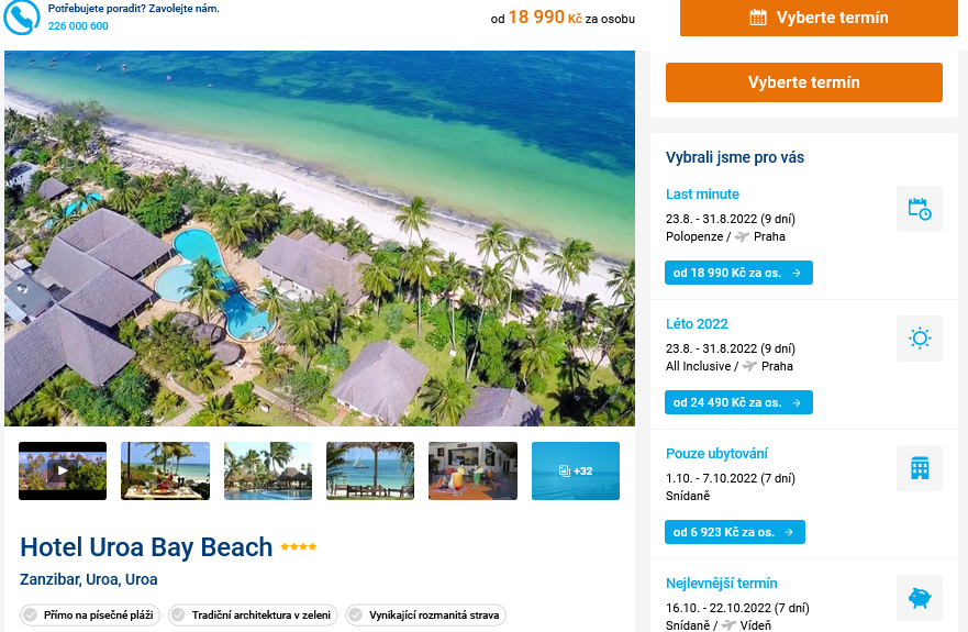 Využijte všech výhod Last Minute pobytů a podívejte se za fantastickou cenu na Zanzibar! Aktuálně za pobyt na 9 dní s polopenzí zaplatíte jen 18 990 Kč a odlet je už zítra. Cena dále zahrnuje zpáteční letenky z Prahy, letištní transfery a služby delegáta. Pokud toužíte po All Inclusive, bude vás tato varianta stát 24 490 Kč. Hotel Uroa Bay Beach leží přímo na překrásné písečné pláži.