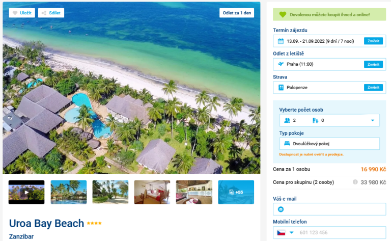 Hledáte exotickou dovolenou a nevadí vám odlety na poslední chvíli? Potom by vás mohl zajímat tento zájezd na Zanzibar, na který se odlétá již zítra dopoledne. Na výběr jsou dvě varianty, a to za 16 990 Kč s polopenzí, nebo za 20 990 Kč se stravou All Inclusive. V ceně je dále ubytování v hotelu na 9 dní, zpáteční letenky s odletem z Prahy, letištní transfery a podpora delegáta. S nákupem rozhodně nečekejte, ať si stihnete zařídit vše potřebné.