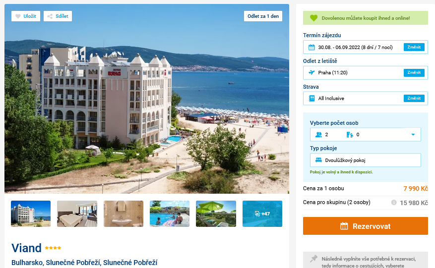 Počasí u nás se sice zlepšilo, ale nic se nevyrovná relaxu u moře. Pokud čerpáte dovolenou, ale zatím jste nad zahraničím nepřemýšleli, názor by vám mohl změnit náš tip na pobyt v Bulharsku. Zájezd vás bude stát 7 990 Kč a zahrnuje ubytování v hotelu s programem All Inclusive, zpáteční letenky z Prahy, letištní transfery a služby delegáta. Hotel Viand najdete v letovisku na oblíbeném Slunečném pobřeží, přímo u písečné pláže. Na palubu si přibalte našeho online průvodce Bulharskem, ve kterém najdete tipy na výlety a informace o jednotlivých letoviscích.