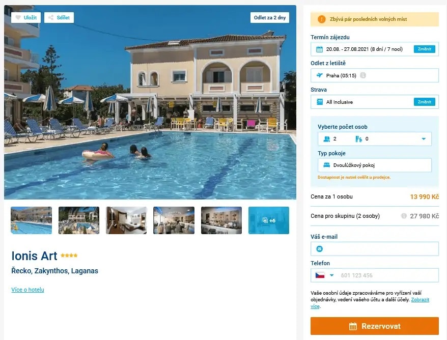 Hledáte pro strávení vaší dovolené opravdu jedinečné místo s veškerým servisem? S naším tipem můžete vyrazit na řecký ostrov Zakynthos a to již za dva dny, v termínu 20. 8. – 27.8.2021. Hotel je vymezený pouze pro hosty 18+, nemusíte se tak bát, že by vás během pobytu obtěžoval dětský křik. Nedaleko hotelu Ionis Art navíc naleznete bary a restaurace, o zábavu tak rozhodně nebude nouze. Za cenu 13 990 Kč pořídíte kompletní dovolenou organizovanou cestovní kanceláří. Balíček obsahuje ubytování ve výborně hodnoceném čtyřhvězdičkovém hotelu, zpáteční letenky z Prahy, služby delegáta, letištní transfery a stravování formou All Inclusive. Pro tipy na zajímavá místa a praktické informace nezapomeňte navštívit našeho podrobného online průvodce
