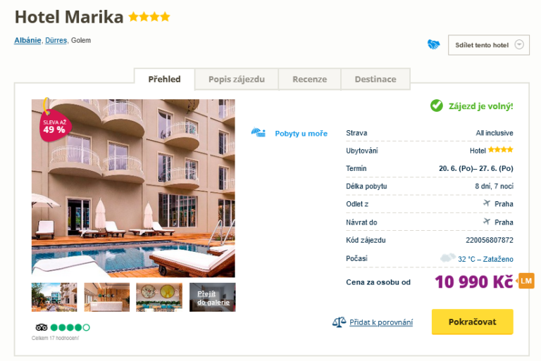 Pokud právě listujete katalogy cestovních kanceláří a zajímala by vás nějaká méně tradiční destinace, mohli bychom vám vyhovět následujícím tipem. V něm se budeme bavit o pobytovém zájezdu do Albánie, za který zaplatíte jen 10 990 Kč. Cena zahrnuje ubytování na 8 dní ve čtyřhvězdičkovém hotelu s programem All Inclusive, zpáteční letenky z Prahy, letištní transfery a služby delegáta. Nedávno zrekonstruovaný hotel Marika leží jen pár kroků od písečné pláže, kde mají hoteloví hosté zdarma k dispozici lehátka i slunečníky. Do odletu zbývá ještě několik dní, máte tak dostatek času na přípravy.