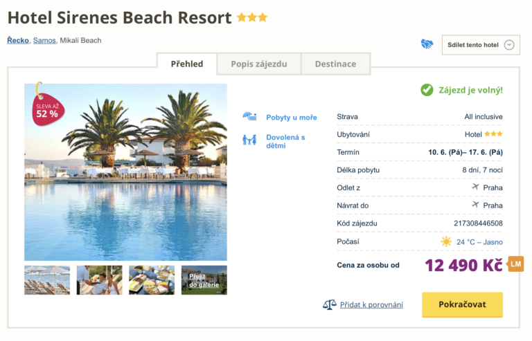 Inspirujte se naším dalším dnešním tipem a vydejte se na krásné pláže řeckého ostrova Samos! Dovolenou na tomto ostrově aktuálně pořídíte za cenu 12 490 Kč. V ceně jsou zahrnuty letenky, letištní transfery v místě, ubytování ve skvěle hodnoceném resortu, stravování all inclusive a služby delegáta. Hotel se nachází nedaleko oblázkové pláže, na které můžete zdarma využívat lehátka i slunečníky. Před cestou nezapomeňte nahlédnout do našeho online průvodce Samosem, kde najdete tipy na výlety a informace o ostrově. Pokud se rozhodnete nabídky využít, na Samos se podíváte v termínu 10.6. – 17. 6. 2022.