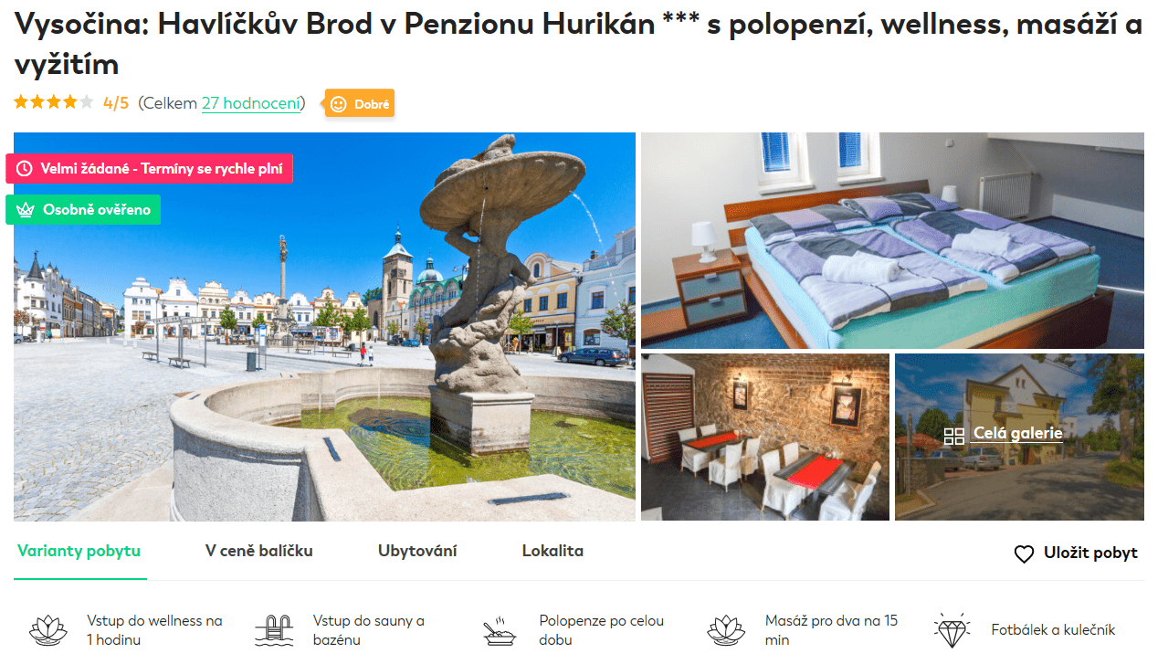 Pro odpočinek nemusíte cestovat daleko. Stačí vyrazit na Vysočinu, konkrétně do Havlíčkova Brodu. Tu se můžete na dvě noci ubytovat v krásném penzionu Hurikán. Za tři dny a dvě osoby pak zaplatíte pouhých 2099 Kč. V této ceně máte kromě ubytování i polopenzi, masáž a vstup do wellness. Kdyby vám dvě noci nestačily, můžete si zakoupit pobyt až na 7 nocí. Poukaz je pak nutné využít do 20. prosince.
