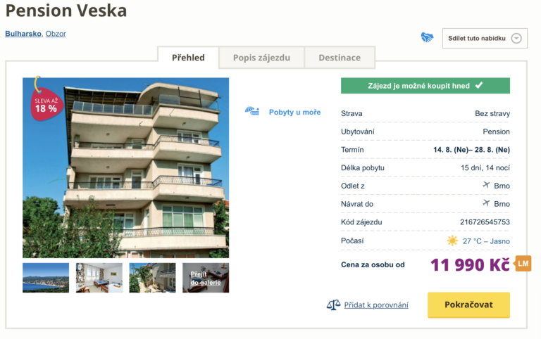 Láká vás dovolená v Bulharsku a letiště v Brně nemáte daleko? Zájezd na 15 dní do letoviska Obzor můžete aktuálně pořídit za cenu 11 990 Kč. Cena zahrnuje letenky (odlet z Brna), letištní transfery v místě, ubytování na 14 nocí a služby delegáta. Oblíbený penzion leží nedaleko centra letoviska i pláže. Před cestou se nezapomeňte inspirovat v našem podrobném průvodci Bulharskem, ve kterém najdete rady pro vaši cestu a tipy na výlety.