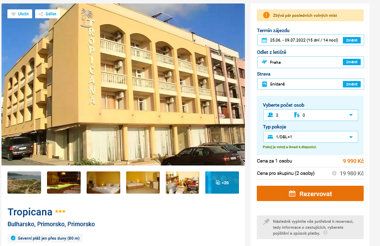 Už vás rozčilují nekonečné nabídky Last Minute pobytů? Pokud si potřebujete dovolenou naplánovat s větším časovým předstihem, mohl by se vám líbit tento článek. V něm vám ukážeme dovolenou v Bulharsku, na kterou můžete vyrazit až na přelomu června a července. Cílovou destinací je Primorsko a hotel Tropicana, který je jen pár kroků od píseční pláže. Cena za pobytový balíček s cestovní kanceláří je 9 990 Kč a zahrnuje ubytování v hotelu na 15 dní se snídaní, zpáteční letenky z Prahy, letištní transfery a služby delegáta. Na palubu si přibalte našeho online průvodce Bulharskem, ve kterém najdete rady pro vaši cestu a tipy na výlety.