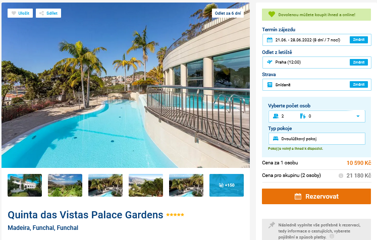 Rádi kombinujete aktivní dovolenou s odpočinkem na pláži? Potom věnujte zvýšenou pozornost následujícímu příspěvku. V něm vás pozveme na Madeiru, konkrétně do města Funchal. Zájezd, organizovaný cestovní kanceláří, zahrnuje pouze snídaně, nic vám tak nebude bránit v podnikání výletů. Zároveň budete bydlet v 5* hotelu, takže po návratu vás čeká maximální možný komfort. Za celou dovolenou zaplatíte 10 590 Kč a kromě výše zmíněného cena zahrnuje zpáteční letenky z Prahy, letištní transfery v místě pobytu a služby delegáta. Na plánování máte ještě pár dní čas, odlétá se až 21.6.2022. Inspiraci můžete načerpat v našem podrobném průvodci ostrovem, ve kterém najdete mnoho rad a tipů.