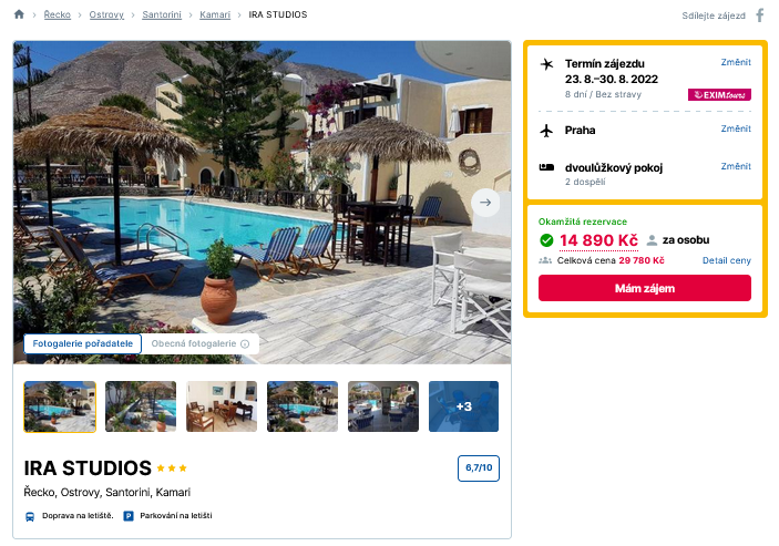 Je vaším snem návštěva Santorini a preferujete organizované pobyty s cestovní kanceláří? Pak se vám jistě bude líbit zájezd, který vám ukážeme v následujícím tipu. Cena dovolené je 14 890 Kč a zahrnuje ubytování ve studiích na 8 dní, zpáteční letenky z Prahy, letištní transfery a k ruce vám bude zkušený delegát. Studia Ira najdete v klidné destinaci Kamari, pár minut od příjemné promenády. Určitě nezapomeňte nahlédnout do našeho online průvodce tímto ostrovem, ve kterém najdete informace a tipy na výlety.