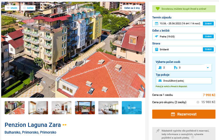 Týdenní pobyty jsou pro vás málo, ale zároveň nechcete za dovolenou utratit majlant? Potom pokračujte dále ve čtení. V katalogu cestovní kanceláře se totiž objevil 16 denní pobyt se snídaní v Bulharsku, na který můžete vyrazit již za dva dny. Za celou dovolenou zaplatíte jen 7 990 Kč a v této částce je dále zahrnuto ubytování v penzionu, zpáteční letenky z Prahy, letištní transfery i služby delegáta. Penzion Laguna Zara leží v oblíbením letovisku Primorsko, jen 300m od písečné pláže. Před cestou si prolistujte našeho online průvodce Bulharskem, ve kterém najdete tipy na výlety a informace o jednotlivých letoviscích.