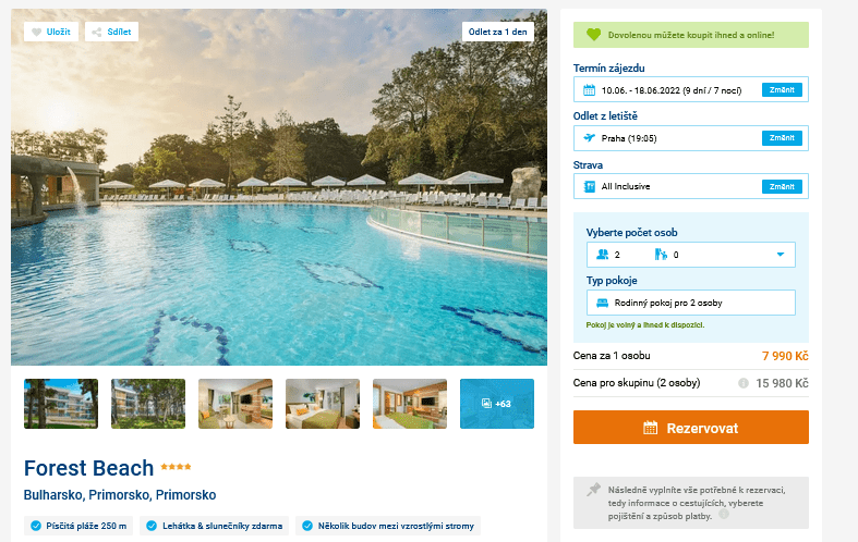 Dnes vám přinášíme další akční nabídku na pobyt v Bulharsku. Jedná se o Last Minute dovolenou s odletem na poslední chvíli, proto vás rozhodně potěšíme příjemnou cenou. Konkrétně se můžete podívat do Primorska a za 7 990 Kč pořídíte ubytování ve čtyřhvězdičkovém hotelu na 9 dní, balíček All Inclusive, zpáteční letenky z Prahy, letištní transfery a služby delegáta. Budovy hotelu Forest Beach jsou zasazeny do příjemného prostředí mezi vzrostlými stromy a pláž je vzdálena jen 250m. Lehátka i slunečníky zde mají hosté k dispozici zdarma. Před cestou se nezapomeňte inspirovat v našem podrobném průvodci Bulharskem, ve kterém najdete rady pro vaši cestu a tipy na výlety.