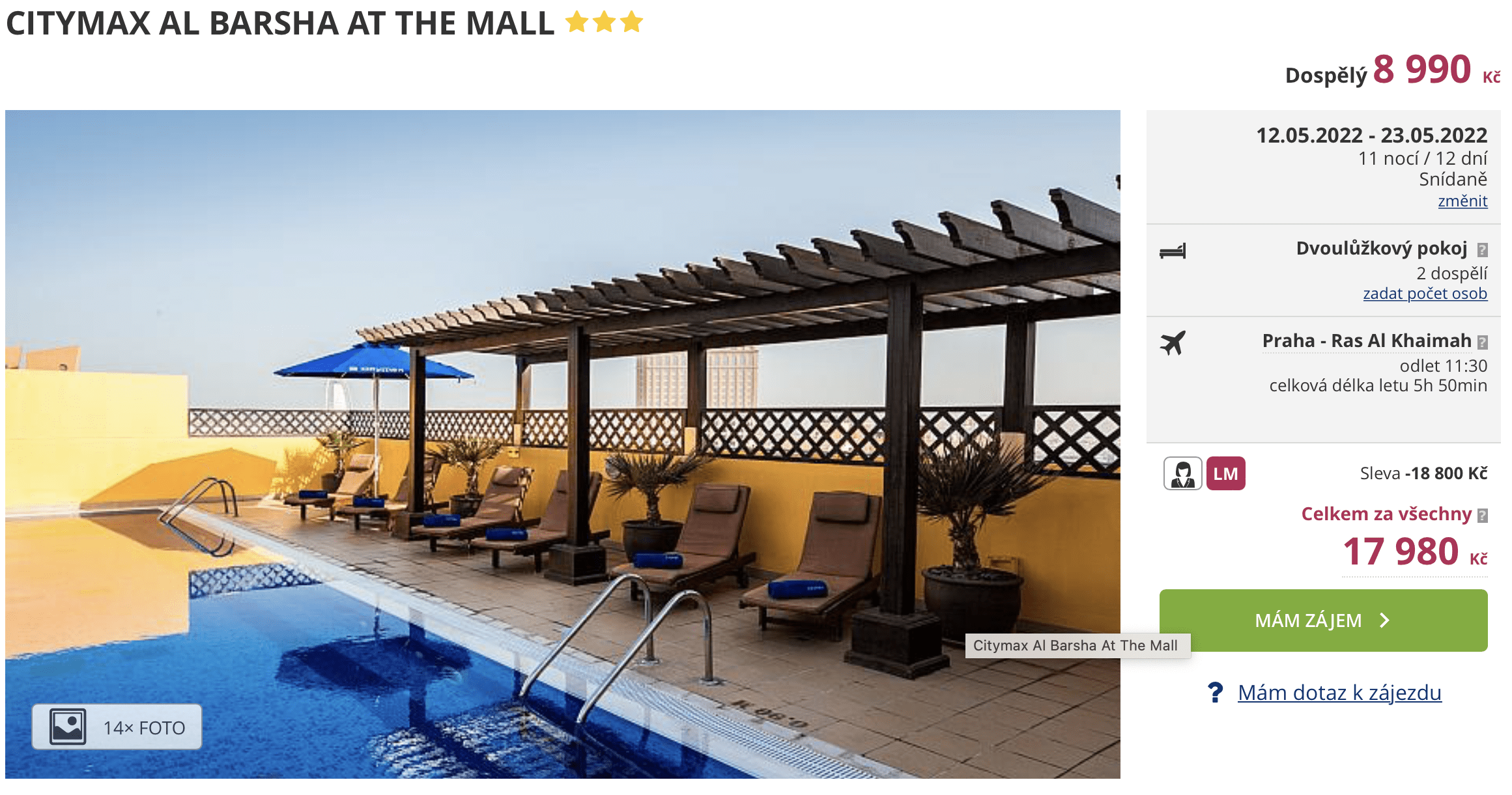 Sníte o návštěvě Dubaje? Tento sen se už za pár dní může stát realitou, pokud využijete akční last minute nabídky cestovní kanceláře. Za parádní cenu 8 990 Kč můžete pořídit 12denní zájezd do tohoto moderního velkoměsta. V ceně jsou zahrnuty zpáteční letenky z Prahy, letištní transfery v místě pobytu, ubytování na 11 nocí, snídaně a služby delegáta.Hotel se nachází v samém srdci města, nedaleko všech vyhledávaných turistických atrakcí a nákupních center. Před cestou se nezapomeňte inspirovat v našem online průvodci městem, kde najdete tipy pro váš itinerář. S nákupem příliš dlouho neváhejte, odlet je již za dva dny!