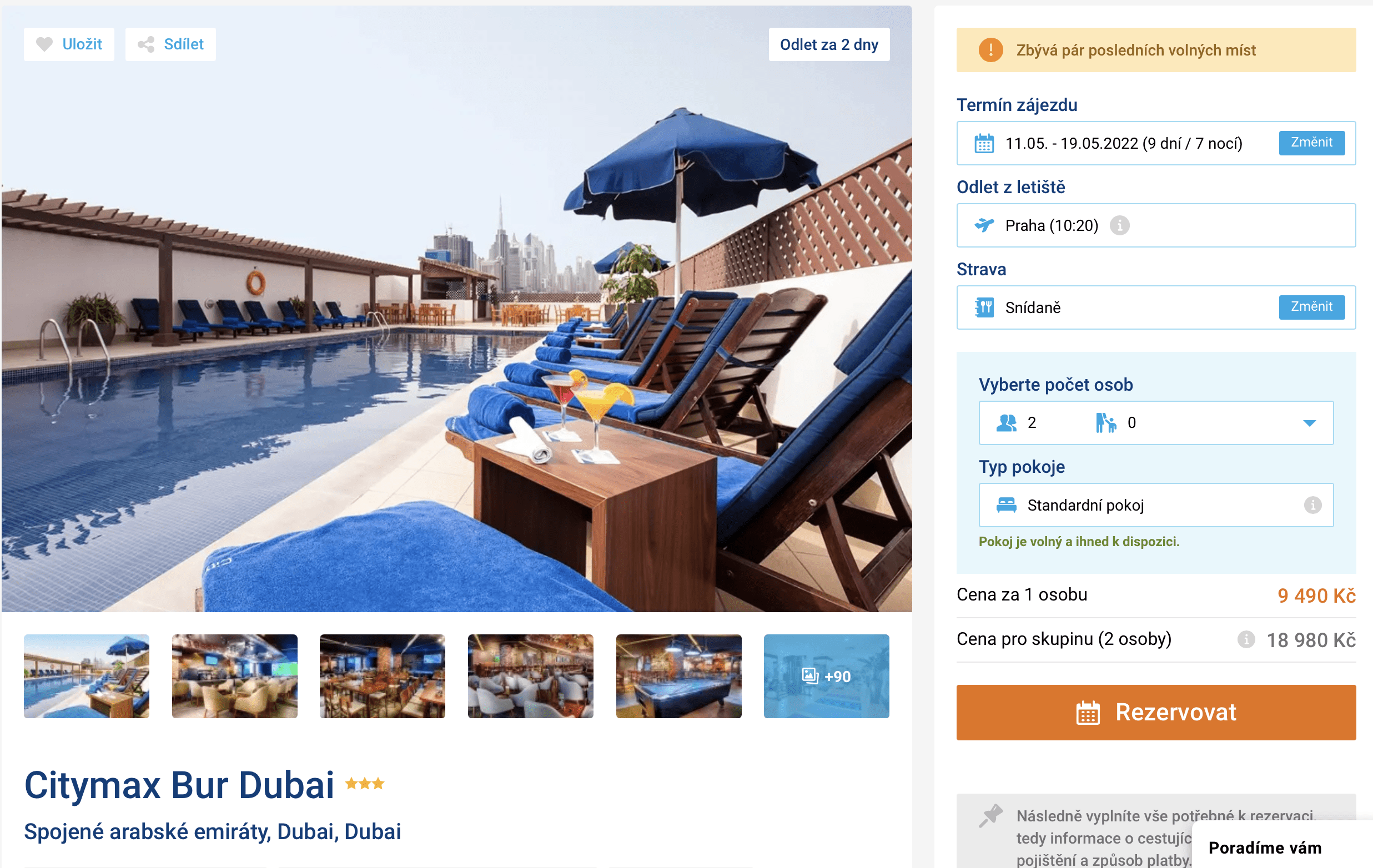Láká vás navštívit moderní Dubaj? V tom případě by vám neměl uniknout náš další tip! V nabídce cestovní kanceláře se objevil last minute zájezd do Dubaje za parádní cenu 9 490 Kč. V ceně jsou zahrnuty zpáteční letenky z Prahy, letištní transfery v místě pobytu, ubytování na 7 nocí, snídaně a služby delegáta.Před cestou určitě nakoukněte do našeho online průvodce městem, kde najdete informace a tipy pro váš itinerář. Hotel Citymax Bur Dubai má ideální polohu a je situován nedaleko rušných tržišť a nákupních center. Na pláž vás zdarma doveze hotelová kyvadlová doprava.