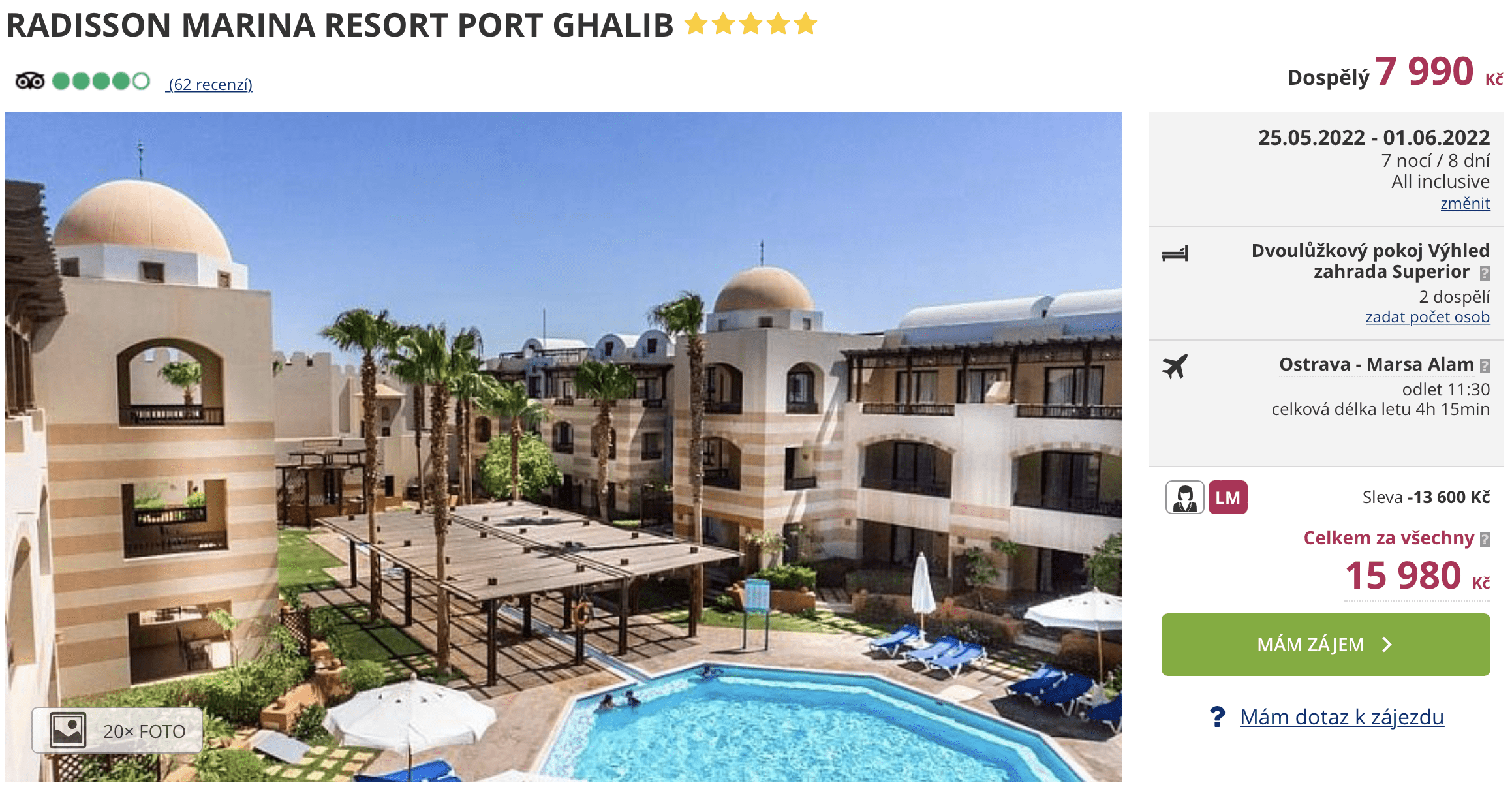 Dopřejte si pořádnou dovolenou plnou odpočinku! V nabídce cestovní kanceláře se objevil zájezd do skvěle hodnoceného 5* hotelu s odletem z Ostravy. Zájezd je nabízen za parádní cenu 7 990 Kč, která zahrnuje zpáteční letenku z Ostravy, letištní transfery v místě, ubytování v 5* hotelu a all inclusive stravu. Hotel je situován ve městě Port Ghalib nedaleko krásné přístavní promenády. Před cestou určitě nakoukněte do našeho online průvodce Egyptem, kde najdete informace o jednotlivých letoviscích.
