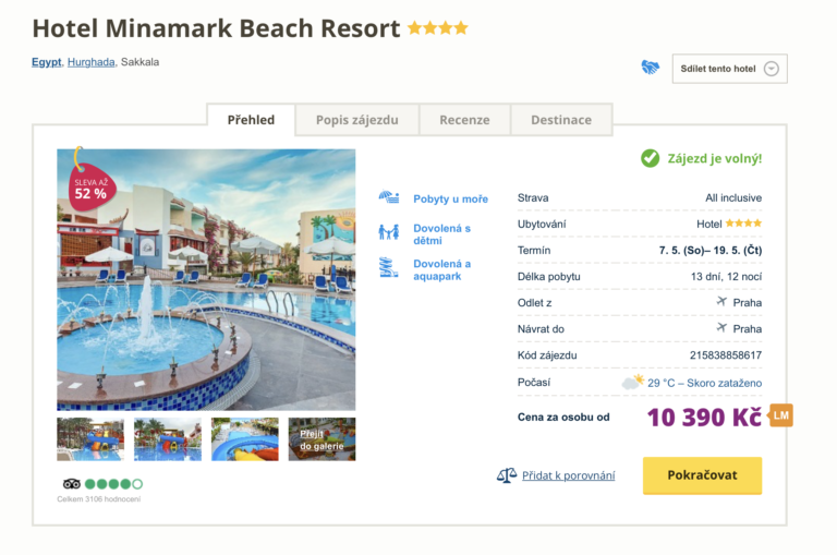 Využijte výhodné last minute nabídky na zájezd do Egypta! V egyptském letovisku Hurghada si můžete dopřát 13denní all inclusive dovolenou za skvělou cenu 10 390 Kč. Tato cena zahrnuje zpáteční letenky z Prahy, letištní transfery v místě pobytu, stravování formou all inclusive, ubytování na 13 dní a služby delegáta. Zájezd se koná v termínu 7.5. – 19.5. 2022. Výborně hodnocený hotel Minamark Beach Resort se nachází přímo u písčité pláže s pozvolným vstupem do moře. Před cestou se nezapomeňte inspirovat v našem online průvodci Egyptem, kde najdete informace o jednotlivých letoviscích a tipy na výlety.