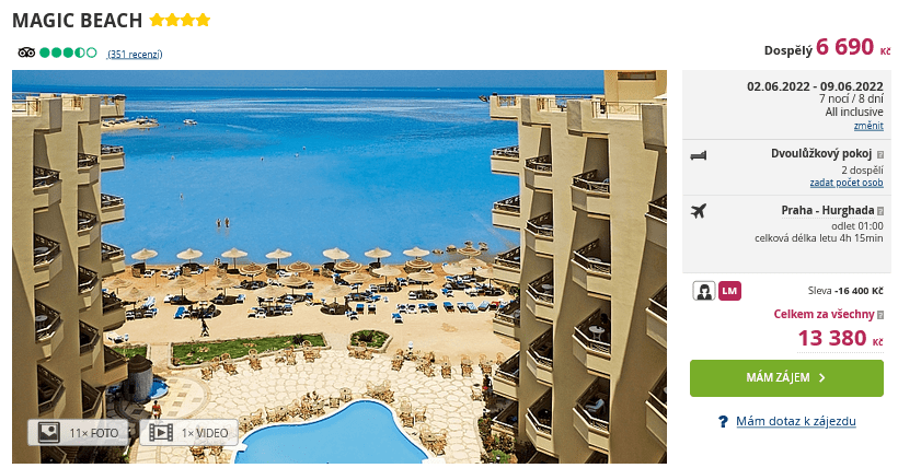 Největším lákadlem Last Minute pobytů je zajisté cena. Proto, pokud vám nevadí odlet na poslední chvíli, by byla škoda tohoto benefitu nevyužít. Jednu takovou nabídku vám přinášíme v tomto tipu a již zítra se tak můžete podívat do Egypta za 6 690 Kč. Cestovní kancelář se vám postará o ubytování ve 4 hvězdičkovém hotelu na 8 dní, zpáteční letenky z Prahy, stravu All Inclusive, letištní transfery a služby delegáta. Hotel Magic Beach leží v letovisku Hurghada, nejen přímo u písečné pláže, ale také v blízkosti starého centra Hurghady – Daharu. Před cestou nezapomeňte nakouknout do našeho podrobného průvodce Egyptem, ve kterém najdete informace o letoviscích a tipy na výlety.