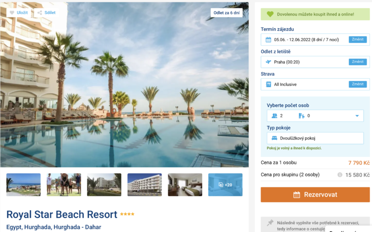 Plánujete zaslouženou dovolenou v Egyptě? V nabídce CK se objevil last minute zájezd do 4* hotelu v letovisku Hurghada. Za cenu 7 790 Kč se vám CK postará o kompletní dovolenou a vy si tak můžete dopřát relax. této ceně je zahrnuta zpáteční letenka z Prahy, letištní transfery v místě, stravování formou all inclusive, ubytování ve 4* hotelu a služby delegáta. Hotel se nachází přímo u písčité pláže, na které můžete zdarma využívat lehátka i slunečníky. Před odletem nezapomeňte nakouknout do našeho podrobného průvodce Egyptem, ve kterém najdete informace o letoviscích a tipy na výlety.