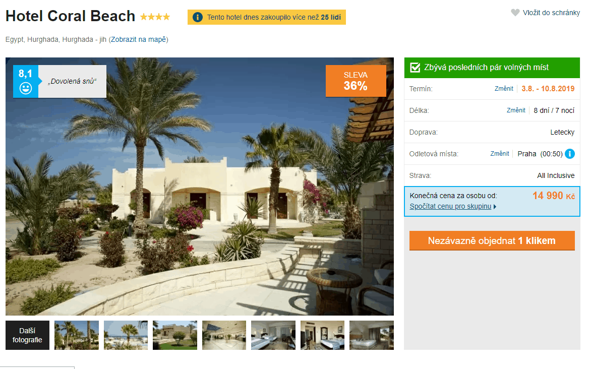 Egypt láká všechny milovníky letních dovolených na dlouhé písečné pláže, křišťálově čisté moře a vysoké teploty. Právě sem se můžete vydat s tímto výrazně zlevněným zájezdem. Ubytováni budete ve výborně hodnoceném hotelu, který se nachází hned vedle nádherné pláže. Tu pokrývá velmi jemný písek a postupně se svažuje až do průzračně čisté vody. Stravování budete mít zajištěno velmi oblíbenou formou all inclusive! Za částku 14 990 Kč získáte kompletní dovolenou – zpáteční letenky s odletem z Prahy, dopravu z letiště do vašeho hotelu a zpět, služby delegáta, ubytování a stravování all inclusive. Pokud vás tento zájezd zaujal, tak příliš dlouho neotálejte, místa rychle mizí! Inspiraci na cestu můžete načerpat v našem podrobném průvodci po Egyptě, který je k přečtení zcela zdarma.