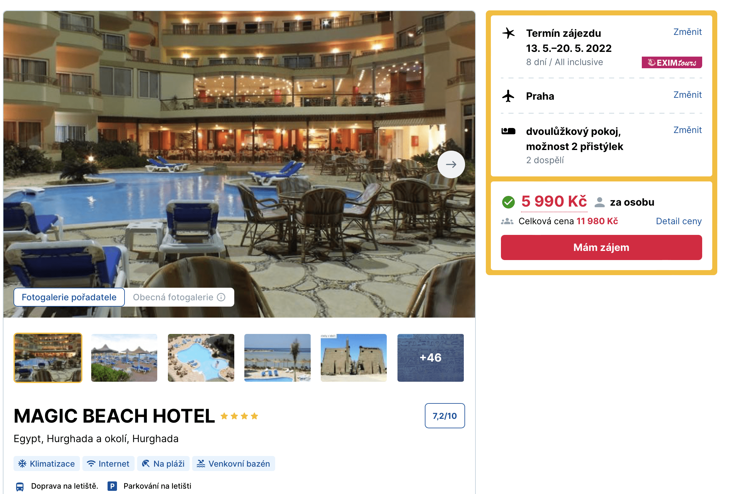 Hledáte výhodný zájezd na poslední chvíli? Díky našemu dalšímu dnešnímu tipu se za pár dní můžete podívat do Egypta. Dovolenou ve 4* hotelu v klidné části letoviska Hurghada aktuálně pořídíte za parádní cenu 5 990 Kč. Tato cena zahrnuje zpáteční letenky z Prahy, letištní transfery v místě pobytu, stravování formou all inclusive, ubytování a služby delegáta. Hotel se nachází přímo u písečné pláže. Před cestou se nezapomeňte inspirovat v našem online průvodci Egyptem, kde najdete tipy na výlety a informace o jednotlivých letoviscích. S rezervací příliš dlouho neváhejte, odlet je již za dva dny.
