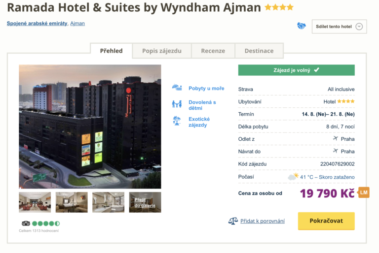 Dopřejte si skvělou dovolenou ve Spojených arabských emirátech! Zájezd do 4* hotelu v emirátu Ajman můžete aktuálně pořídit za cenu 19 790 Kč. V této ceně jsou zahrnuty letenky (odlet z Prahy), letištní transfery v místě, ubytování na 7 nocí, all inclusive strava a služby delegáta. Hotel se nachází v samém  centru emirátu Ajman. Pláž je od hotelu vzdálena přibližně 10 minut jízdy a můžete se na ni zdarma dopravit hotelovým shuttle busem. Pokud plánujete během pobytu navštívit Dubaj, nezapomeňte nakouknout do našeho online průvodce, ve kterém najdete spoustu rad a tipů pro vaši cestu.