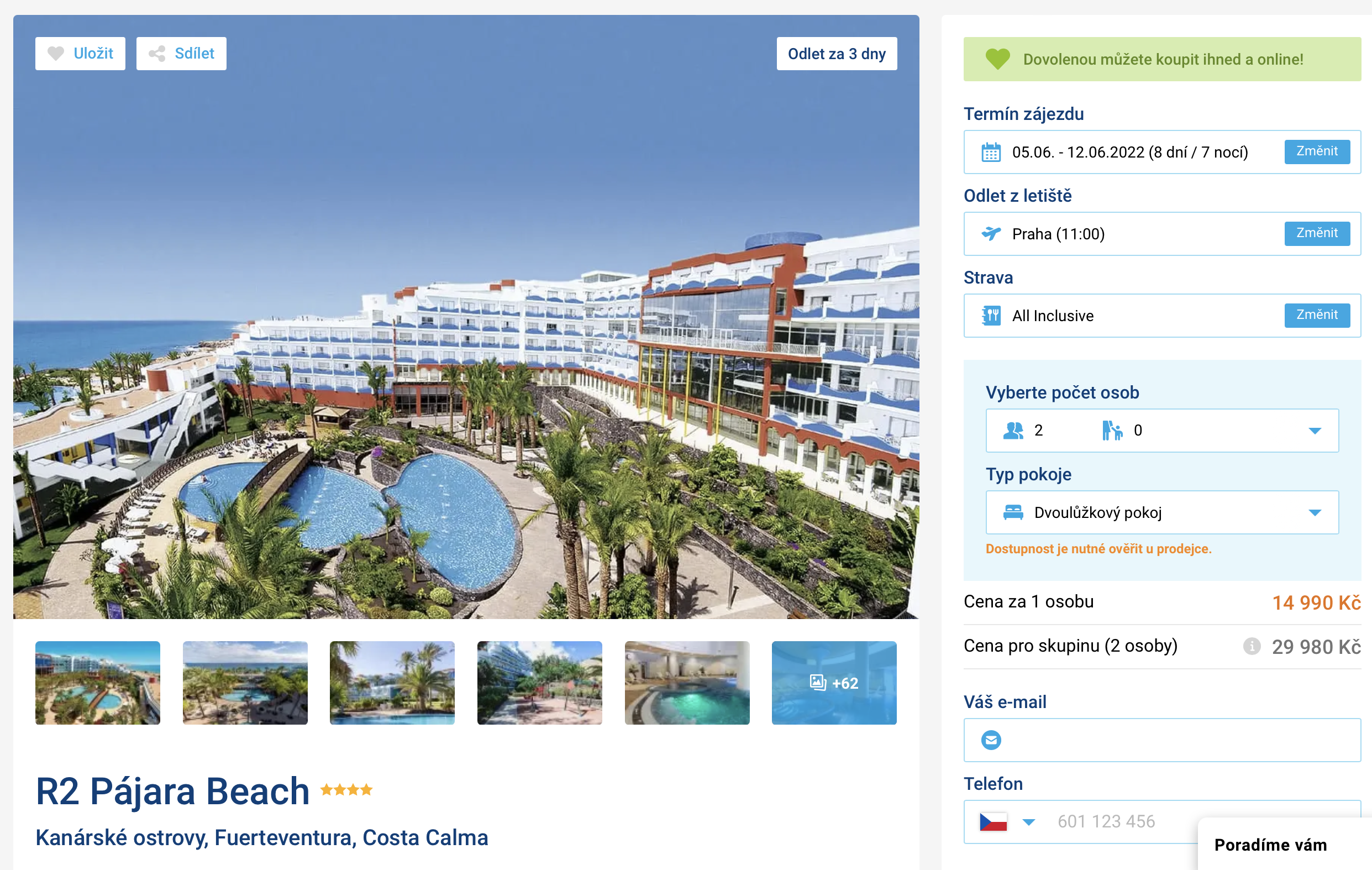 Fuerteventura nabízí krásné pláže a celoročně slunečné počasí! Už za pár dní se můžete ocitnout na tomto ostrově a užívat si pobyt ve skvělém 4* resortu. Zájezd do letoviska Costa Calma aktuálně pořídíte za cenu 14 990 Kč. Cena zahrnuje zpáteční letenku z Prahy, letištní transfery v místě, ubytování, stravování formou all inclusive a služby delegáta.Hotel se nachází přímo u písčité pláže a nabízí animační programy pro děti i dospělé. Inspiraci na výlety a informace o ostrově najdete v našem podrobném průvodci Fuerteventurou.