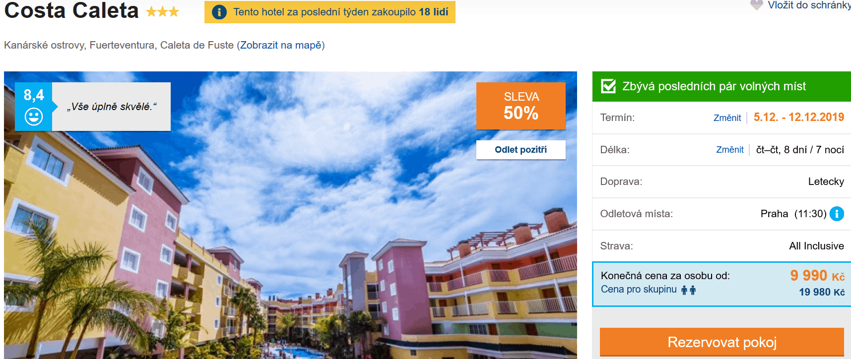 Rok 2019 se pomalu chýlí se svému konci, vy máte však stále příležitost si jeho poslední dny užít v obklopení písku, moře a horkých slunečních paprsků. Využijete-li tedy akční nabídky cestovní kanceláře, můžete se na celých 8 dní vydat na Kanárské ostrovy, konkrétně na Fuerteventuru. V ceně 9990 Kč máte zpáteční letenku z Prahy, dopravu na místě, služby delegáta, ubytování ve výborně hodnoceném hotelu (na Invii získal 8,4/10) a stravování ve formě All Inclusive. Nevíte, co na Fuerteventuře vidět a zažít? Inspirujte se v našem podrobném průvodci. Zájezd je téměř vyprodaný a odlet je již pozítří, proto s rezervací určitě neotálejte.