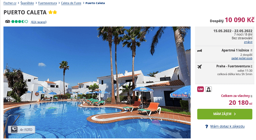 Rádi byste poznali španělský ostrov Fuerteventura, ale na individuální turistiku si zatím netroufáte? Potom pro vás bude ideální volbou zájezd s cestovní kanceláří do letoviska Caleta de Fuste, který je bez zajištěné stravy a vy tak nebudete ničím svázáni během plánování výletů. Dovolená vás vyjde na 10 090 Kč a za tuto cenu pořídíte ubytování v hotelu na 8 dní, zpáteční letenky z Prahy, letištní transfery a služby delegáta. Abychom vám plánování ještě více usnadnili, připravili jsme pro vás online průvodce ostrovem Fuerteventura, kde najdete rady, informace a tipy na výlety.
