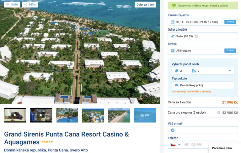 Hledáte dovolenou na poslední chvíli a láká vás exotika? Vydejte se do 5* hotelu v Dominikánské republice za akční cenu 21 990 Kč! Za tuto cenu se vám CK postará o kompletní dovolenou a vy se tak nemusíte téměř o nic starat. V ceně jsou zahrnuty zpáteční letenky z Prahy, letištní transfery v místě pobytu, stravování formou all inclusive, ubytování v 5* hotelu a služby delegáta. Hotel se nachází přímo u pláže Uvero Alto (Macao Beach), na které můžete zdarma využívat lehátka a slunečníky. S nákupem neváhejte, odlet je již zítra 1.11.2021.
