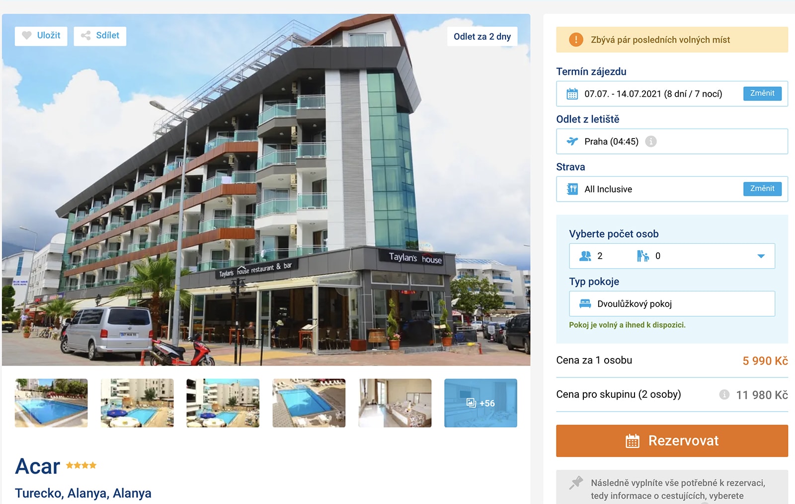 Chcete tento týden odletět k moři a stále čekáte na ten správný zájezd? Přinášíme vám tip na skvělou nabídku od cestovní kanceláře! V termínu 7.7. – 14.7. 2021 si můžete užívat tureckých plážích v letovisku Alanya. V ceně 5 990 Kč jsou zahrnuty letenky, letištní transfer, ubytování ve 4* hotelu, stravování formou all inclusive a služby delegáta! S nákupem příliš dlouho neváhejte, odlet je již pozítří. Informace o Turecku a jednotlivých letoviscích si můžete přečíst v našem online průvodci