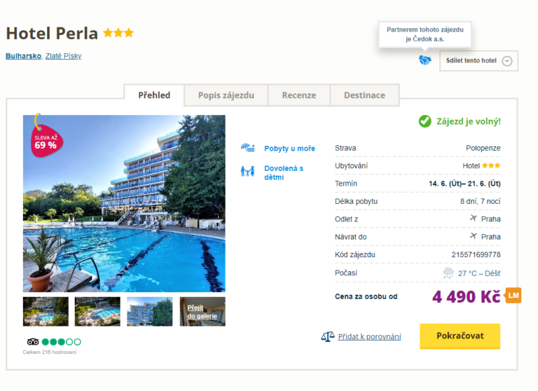 Rádi byste vyrazili do Bulharska, ale náš předchozí tip na All Inclusive dovolenou v letovisku Zlaté písky vás příliš neoslovil? Nezoufejte! V tomto akčním tipu pro vás máme naprosto neodolatelnou nabídku do hotelu Perla na 8 dní se stravou formou polopenze. Tento balíček pořídíte za neuvěřitelných 4 490 Kč. Cena zahrnuje ubytování v hotelu s polopenzí, zpáteční letenky z Prahy, letištní transfery a služby delegáta. Hotel Perla je situovaný v klidné a tiché lokalitě plné zeleně. Rady a tipy navýlety v našem podrobném průvodci Bulharskem.