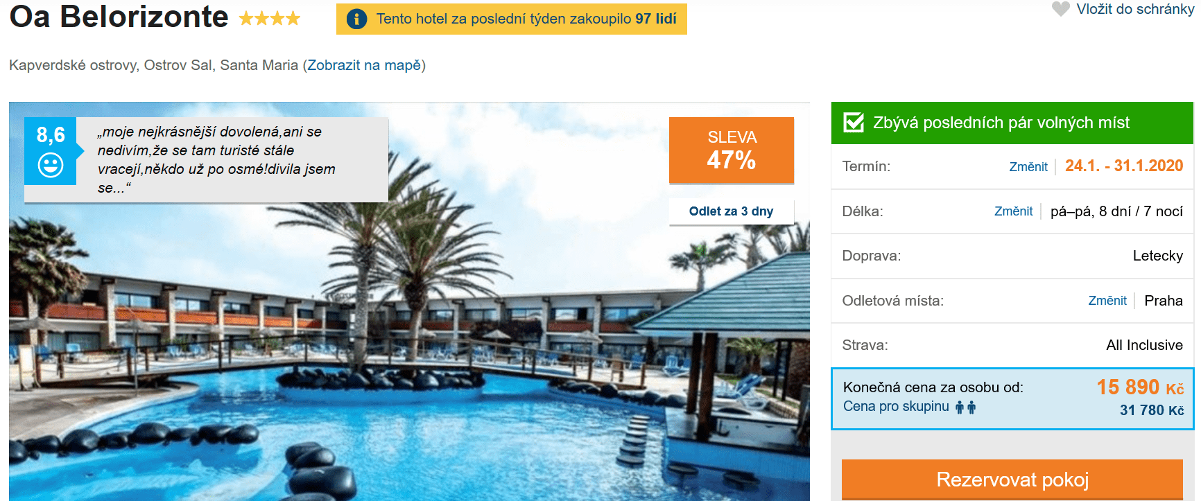 Jestliže byste některou nabídku neměli propásnout, tak to určitě bude tato. Ceny zájezdů na Kapverdské ostrovy na takovouto částku často neklesají, vy tak můžete využít jedinečné šance a užít si dovolenou v jednom z nejoblíbenějších hotelů celého souostroví již za skvělých 15 890 Kč! V ceně máte zpáteční letenku z Prahy, dopravu na místě, služby delegáta, ubytování ve výborně hodnoceném 4* hotelu (na Invii získal 8,6/10) a stravování formou All Inclusive. Odlet je již za tři dny, v případě zájmu s rezervací tedy určitě neotálejte!