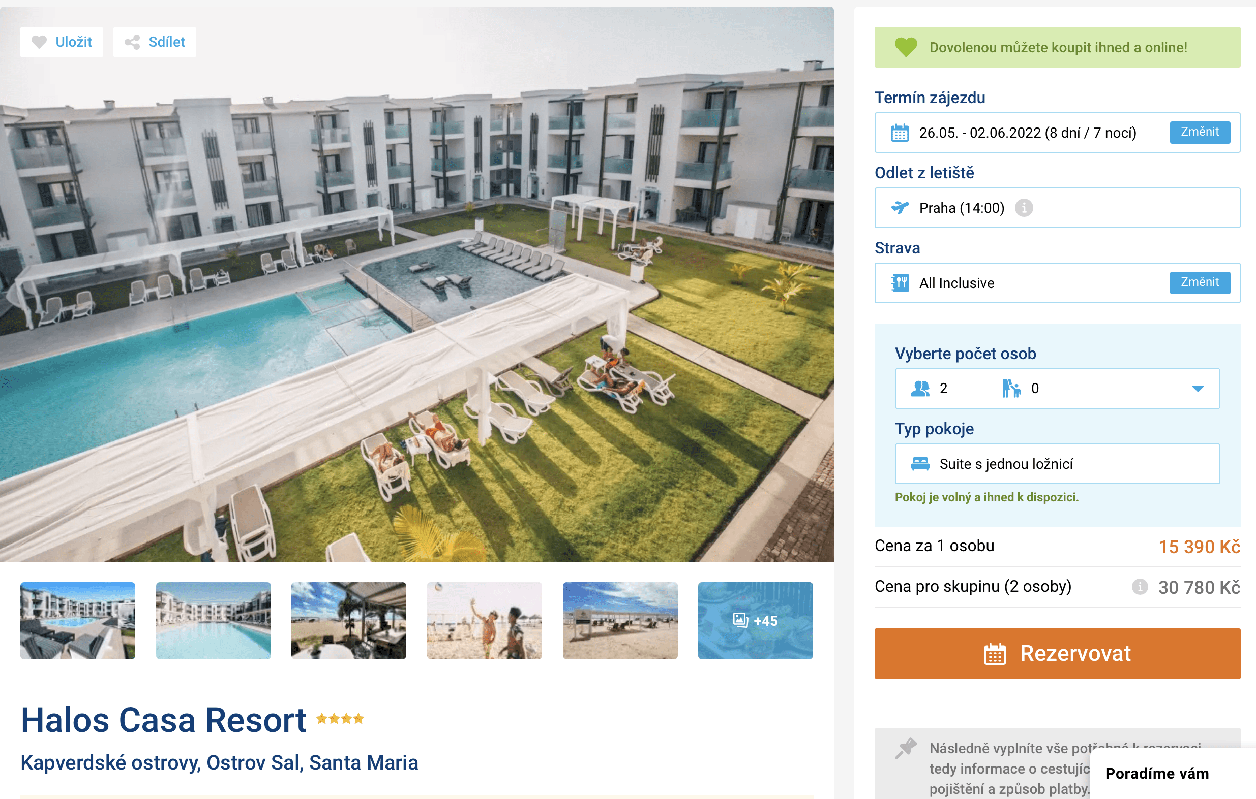 Plánujete letošní dovolenou a vyčkáváte na výhodný last minute zájezd? Díky našemu dnešnímu tipu můžete vyrazit na Kapverské ostrovy! Zájezd za cenu 15 390 Kč zahrnuje zpáteční letenky z Prahy, letištní transfery v místě pobytu, ubytování ve 4* hotelu, all inclusive stravování a služby delegáta. Hotel Halos Casa Resort se nachází nedaleko centra města Santa María a písečné pláže s pozvolným vstupem do moře. Pokud se rozhodnete nabídky využít, na Kapverdy se podíváte v termínu 26.5. – 2.6. 2022.