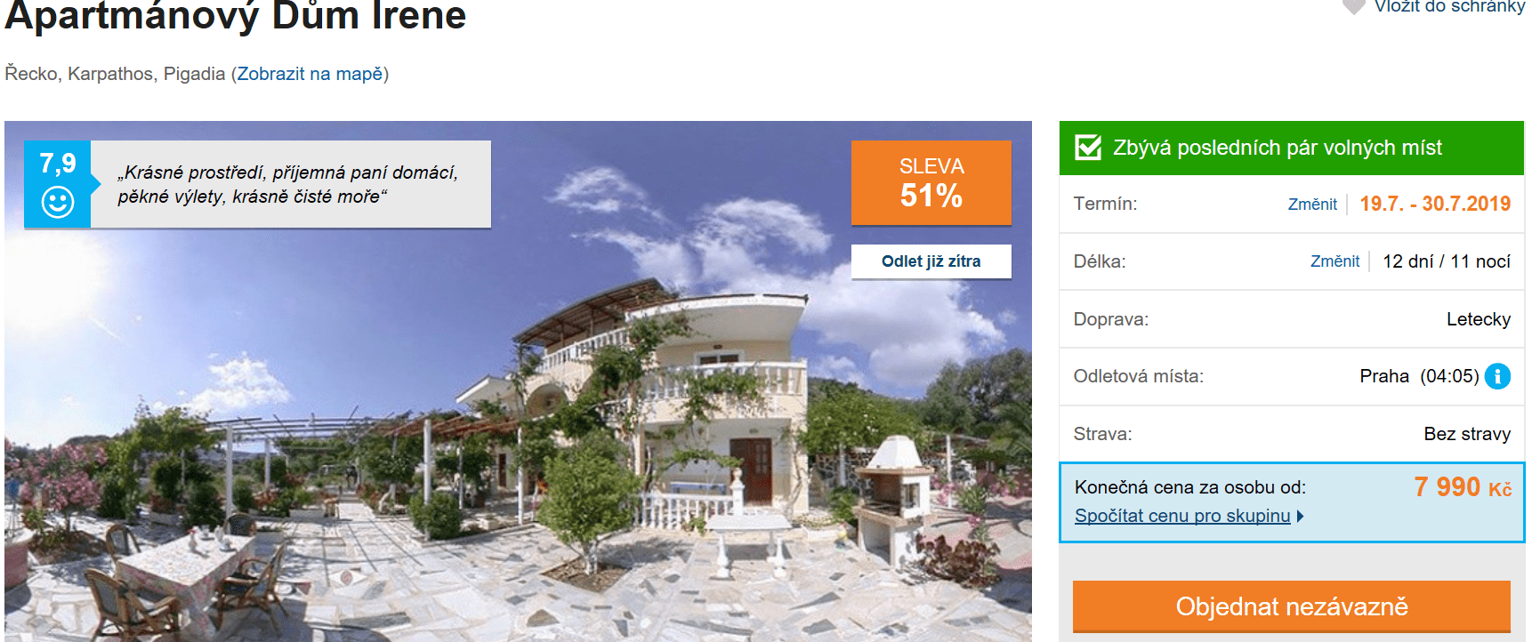Karpathos je jedním z méně navštěvovaných řeckých ostrovů, ale i přes to ukrývá ohromné přírodní bohatství a zejména tu na vás čeká mnohem větší klid než na jiných vyhlášených ostrovech. Zájezd s cestovní kanceláří nyní zakoupíte již za skvělých 7990 Kč! V této ceně máte zpáteční letenku z Prahy, dopravu na místě, služby delegáta a ubytování po celých 12 dní! Inspiraci na cestu můžete načerpat v našem podrobném průvodci po Karpathu, který je k přečtení zcela zdarma! Odlet je již zítra a zbývá posledních pár míst, s rezervací zájezdu tedy rozhodně neotálejte!
