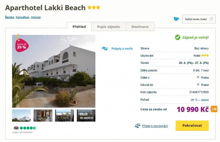 Stále čekáte na tu správnou dovolenou? Pokud vám nevadí odlety na poslední chvíli, již zítra se můžete slunit na řeckém Karpathosu. V termínu 20. 8. – 27. 8. 2021 je posledních pár míst na zájezdu organizovaném cestovní kanceláří. Za cenu 10 990 Kč máte zajištěné ubytování na 8 dní ve výborně hodnoceném hotelu, zpáteční letenky z Prahy, letištní transfery a služby delegáta. Pokud si ještě tisíc korun připlatíte, budou pro vás každé ráno nachystány bohaté snídaně. Hotel se nachází na klidném místě, nedaleko čisté pláže s průzračným mořem. Další možnosti skvělého koupání naleznete v těsné blízkosti. Tento zájezd doporučujeme pro rodiny s dětmi i zamilované páry. Pro inspiraci na zajímavá místa navštivte našeho online průvodce po Karpathosu.