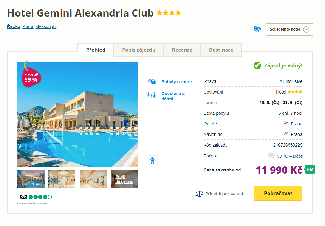 Nejraději byste hodili starosti za hlavu a dopřáli si pořádnou dávku odpočinku? Díky našemu tipu se již zítra můžete vydat na řecký ostrov Korfu. Zájezd do 4hvězdičkového hotelu pořídíte za skvělých 11 990 Kč. Cena zahrnuje letenky s odletem z Prahy, letištní transfery v místě, ubytování ve 4* hotelu, stravování formou All Inclusive a služby delegáta. Zrekonstruovaný hotel se nachází v těsné blízkosti pláže v letovisku Messonghi. Před cestou nezapomeňte nahlédnout do našeho online průvodce ostrovem, ve kterém najdete informace o zajímavých místech.