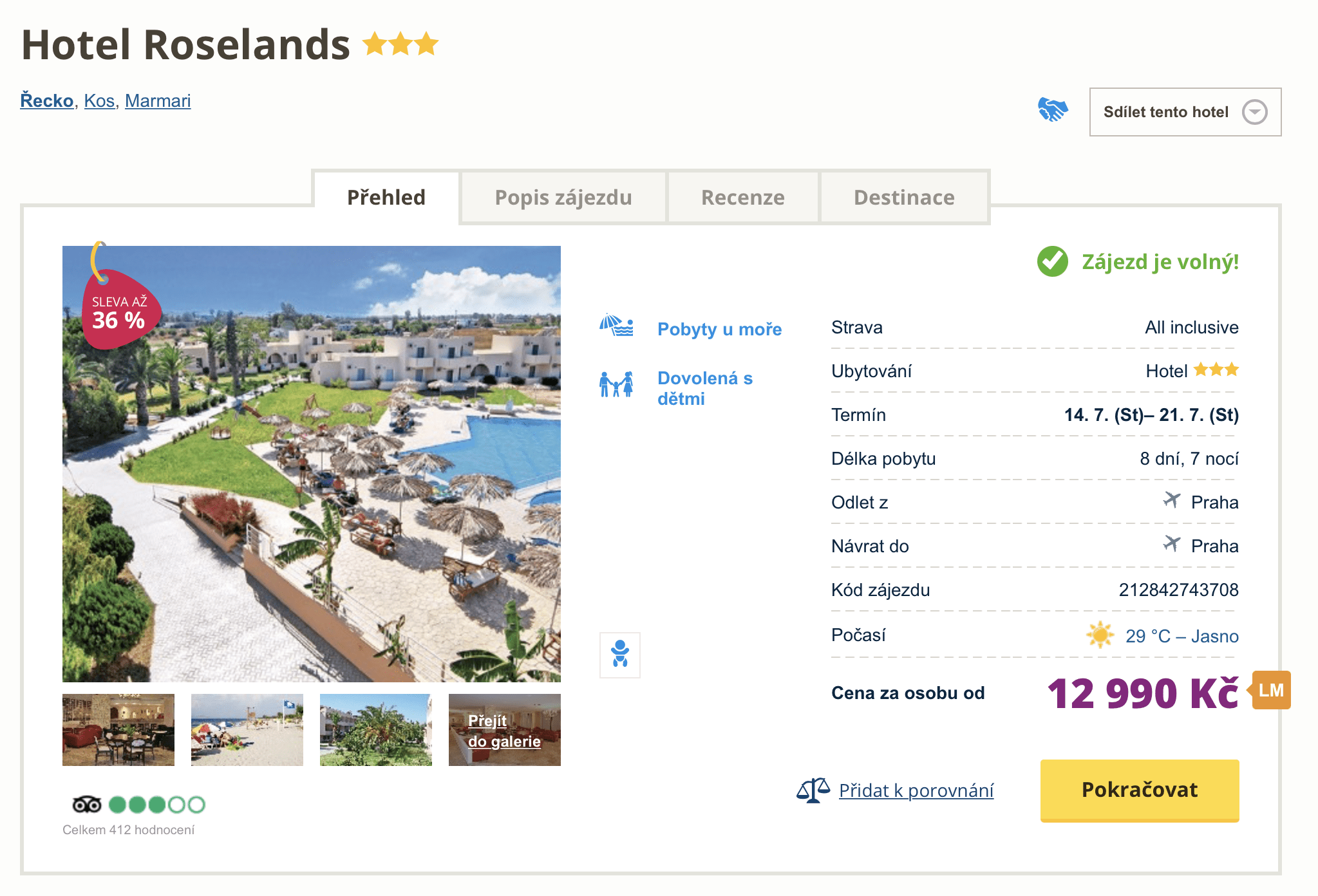 Láká vás řecký ostrov Kos, ale neradi kupujete zájezdy na poslední chvílí? V nabídce cestovní kanceláře se objevil akční zájezd v termínu 14.7. – 21.7. 2021. V ceně 12 990 Kč jsou započítány letenky, letištní transfer, ubytování a stravování formou all inclusive. Kos si jistě zamilujete! Čas strávený na ostrově můžete využít k odpočinku na krásných plážích, toulání se malebnými městy či objevování antických památek. Prohlédněte si našeho online průvodce ostrovem, aby vám neuniklo žádné z míst, která tento ostrov ukrývá.