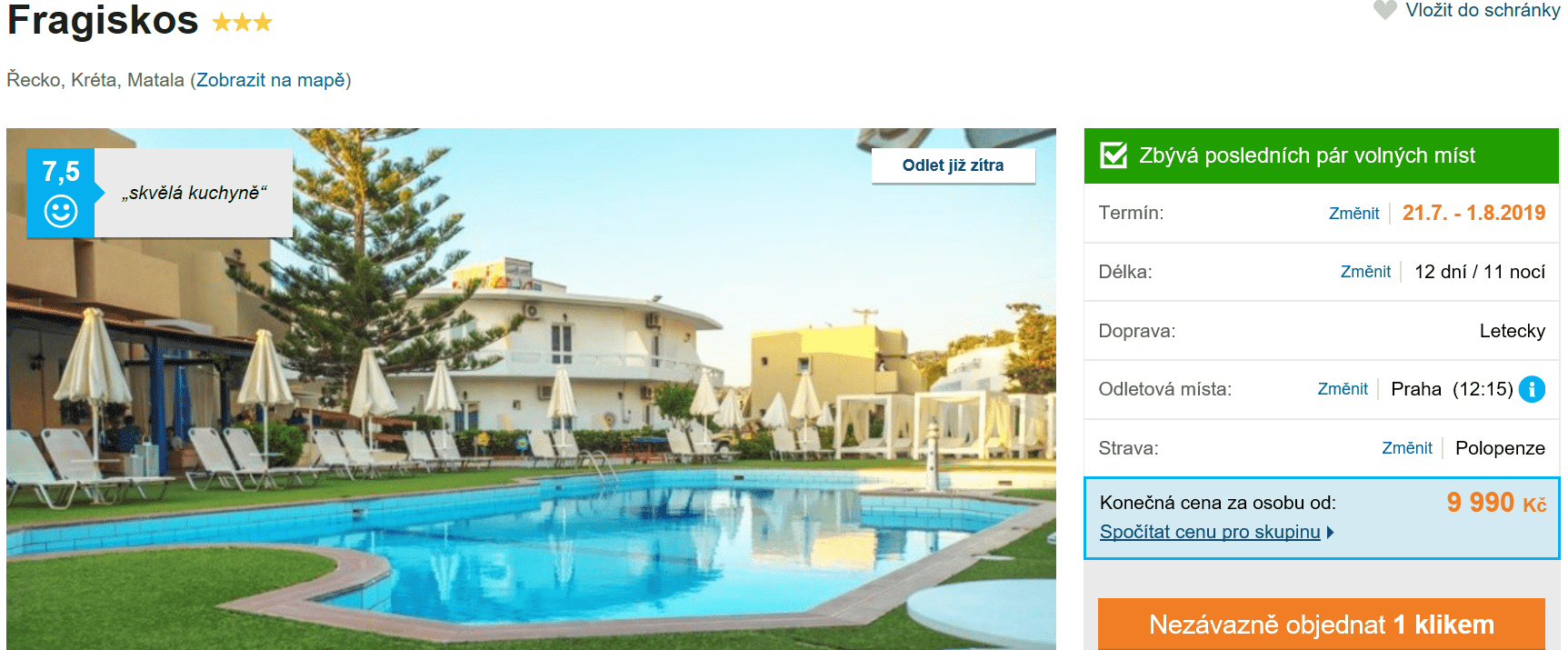 Máte už sbaleno, ale stále čekáte na ideální nabídku last minute zájezdu? V rozhodování vám může pomoci nabídka cestovní kanceláře na překrásnou Krétu. Za skvělou cenu 9990 Kč si můžete užít 12-denní dovolenou, v jejíž ceně máte zpáteční letenku z Prahy, dopravu na místě, služby delegáta, ubytování a polopenzi. Podrobného průvodce po Krétě zdarma naleznete zde. Zájezd je téměř vyprodaný, proto s rezervací určitě neotálejte!