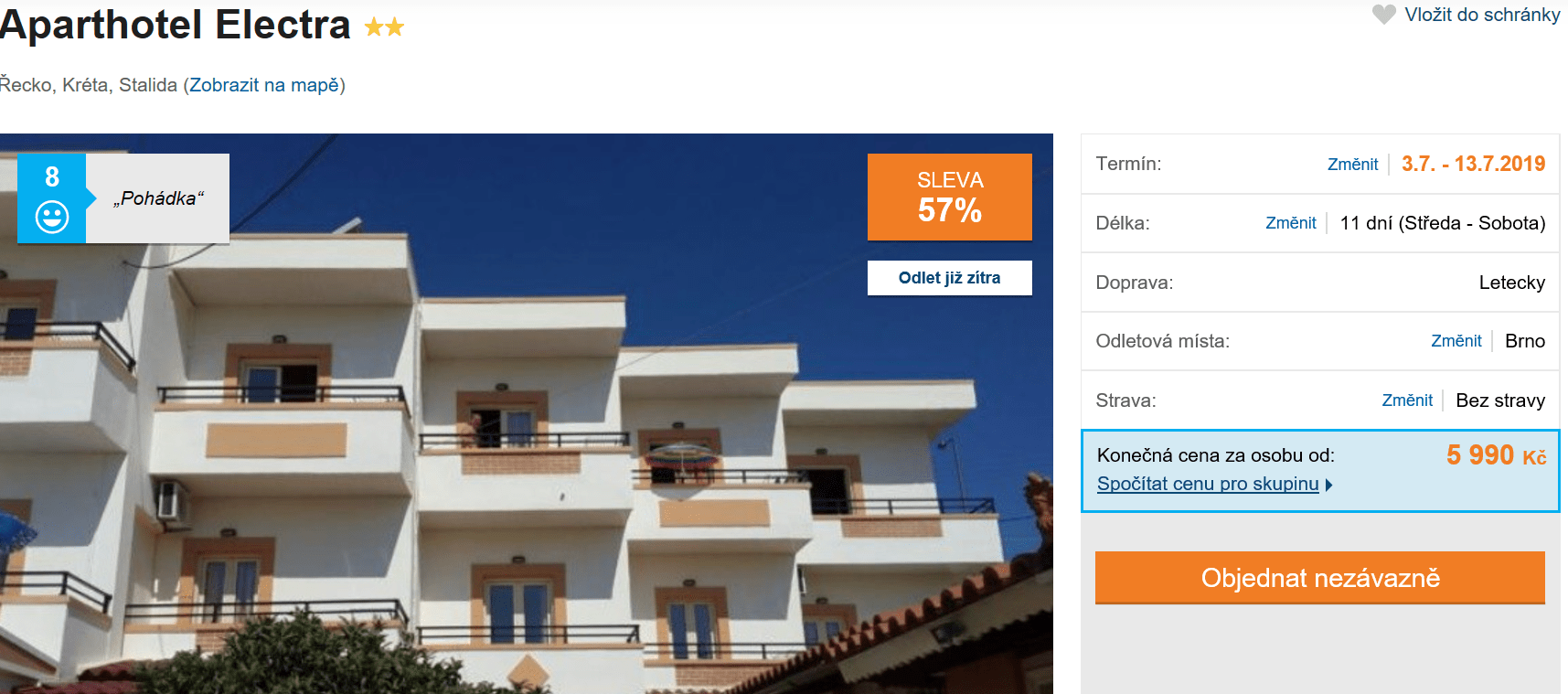Jestliže stále hledáte, kam byste vyrazili na last minute dovolenou a užili si blížící se státní svátky, tak vám v rozhodování může pomoci aktuální nabídka cestovní kanceláře. Již za skvělých 5990 Kč můžete na celých 11 dní vyrazit na krásnou Krétu. V ceně zájezdu máte zpáteční letenku z Brna, dopravu na místě, služby delegáta a ubytování ve skvěle hodnoceném hotelu (na Invii získal 8/10). Inspiraci na cestu můžete načerpat v našem podrobném průvodci po Krétě, který je k dispozici zcela zdarma.