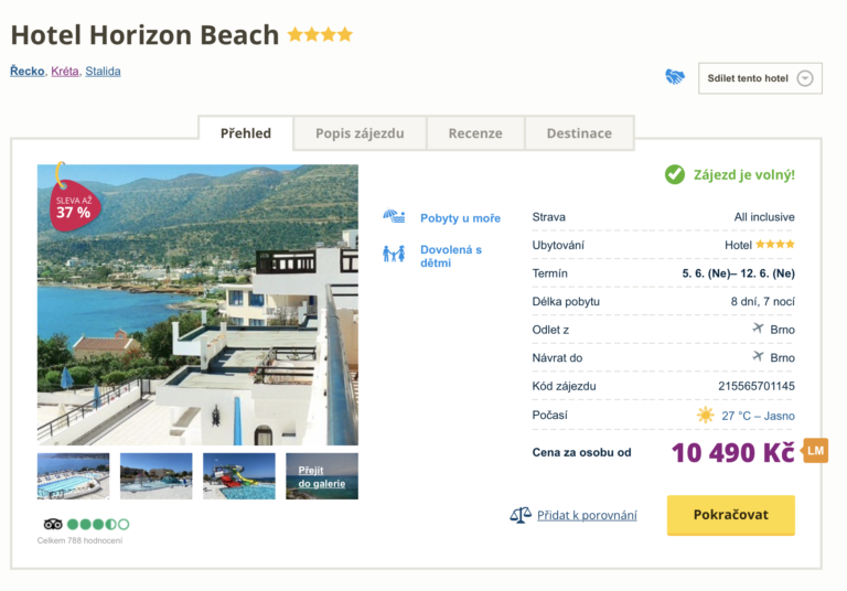 Čeká vás v nadcházejících dnech dovolená, ale stále vyčkáváte na vhodný zájezd? Pokud máte v dosahu letiště v Brně a nevadí vám odlet na poslední chvíli, mohl by vám padnout do oka náš další dnešní tip. Na řecký ostrov Kréta se můžete vydat již zítra a užít si dovolenou ve výborně hodnoceném 4* hotelu. Zájezd je aktuálně nabízen za cenu 10 490 Kč. V této ceně je započítána zpáteční letenka z Brna, letištní transfery v místě, ubytování v hotelu, stravování all inclusive a služby delegáta. Před cestou určitě nezapomeňte nakouknout do našeho online průvodce Krétou, ve kterém najdete informace o ostrově a tipy na výlety.
