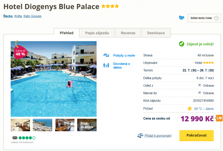 Jestliže byste se již ve středu rádi slunili na pláži či u bazénu a popíjeli osvěžující drinky, pak si nenechte ujít akční nabídku cestovní kanceláře za 12 990 Kč. Ta vás zavede na Krétu, konkrétně pak do letoviska Kato Gouves. V ceně zájezdu pak máte zahrnuty zpáteční letenky z Ostravy, dopravu na místě, služby delegáta, ubytování ve 4* hotelu a stravování formou All Inclusive. Inspiraci na výlety po Krétě můžete načerpat v našem podrobném průvodci zdarma.