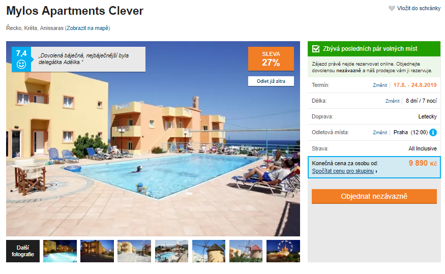 Lákají vás nádherné písečné pláže, vynikající taverny s výtečnými pokrmy a tradiční řecký styl života? Pokud ano, tak vyrazte na tento výrazně zlevněný zájezd. Ubytováni budete v dobře hodnoceném hotelu, který je vzdálen je pár minut chůze od průzračně čistého Středozemního moře. Stravování je zajištěno velmi oblíbenou formou all inclusive. Za částku 9890 Kč získáte kompletní dovolenou – zpáteční letenky s odletem z Prahy, dopravu z letiště do vašeho hotelu a zpět, služby delegáta, ubytování a stravování. Pokud vás tento zájezd zaujal, tak příliš dlouho neotálejte, místa rychle mizí! Inspiraci na cestu můžete načerpat v našem podrobném průvodci po Krétě, který je k přečtení zcela zdarma.