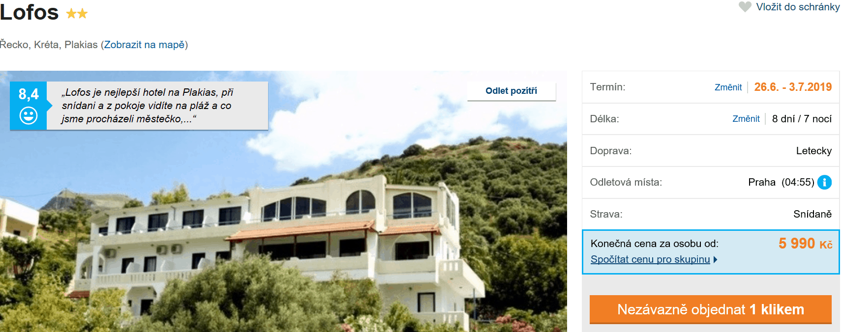 Romantické zálivy, tradiční rybářské vesničky, výborné víno i atraktivní turistické lokality. To vše a mnohem víc nabízí krásný řecký ostrov Kréta, kam se nyní můžete vydat s cestovní kanceláří již za skvělých 5990 Kč! V této ceně máte zpáteční letenku z Prahy, dopravu na místě, služby delegáta, ubytování ve výborně hodnoceném hotelu (na Invii získal 8,4/10) a snídaně, a to vše po celých 8 dní! Inspiraci na cestu můžete načerpat v našem podrobném průvodci po Krétě.