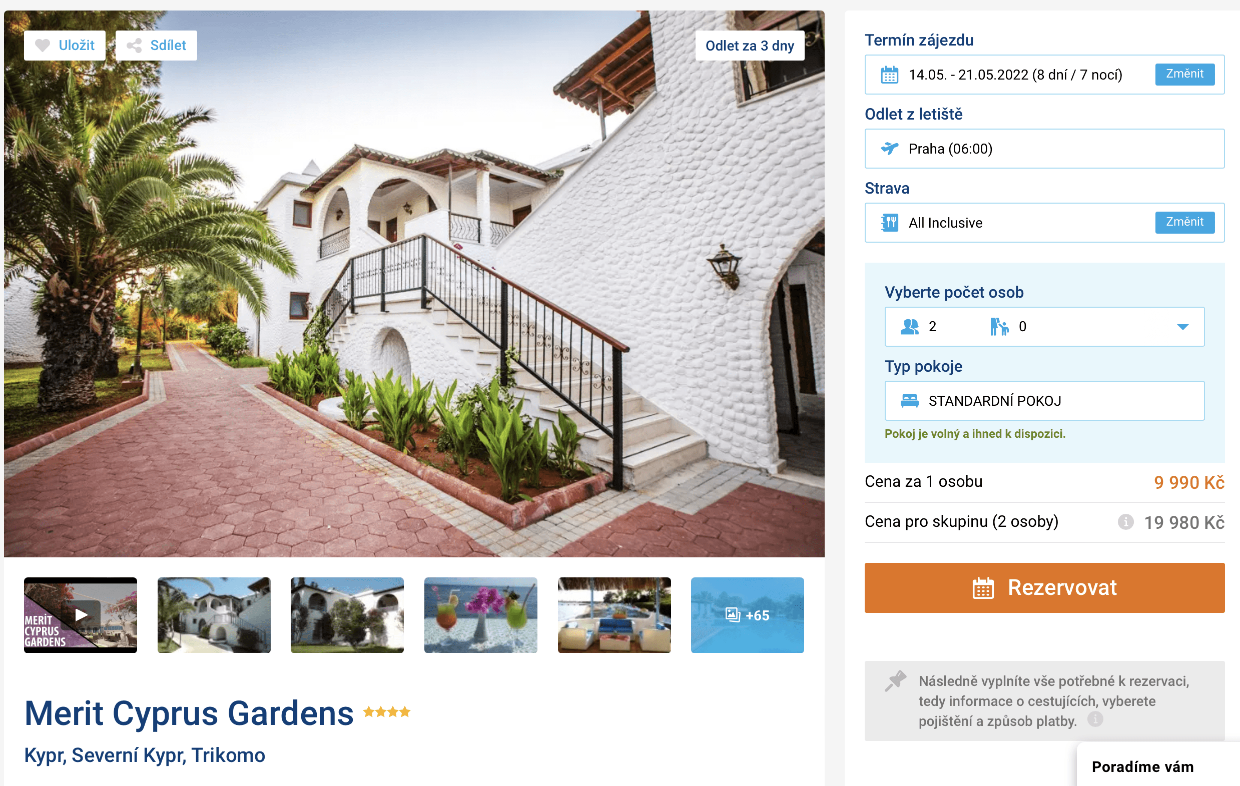 Plánujete v nejbližších dnech vyrazit za sluníčkem? Díky našemu dnešnímu tipu můžete vyrazit za krásné kyperské pláže! Zájezd na Severní Kypr od cestovní kanceláře je aktuálně nabízen za cenu 9 990 Kč. V této ceně jsou zahrnuty zpáteční letenky z Prahy, letištní transfery v místě pobytu, ubytování ve 4* hotelu, stravování formou all inclusive a služby delegáta. Skvěle hodnocený 4* resort leží přímo u písečné pláže s pozvolným vstupem do moře. Na pláži můžete zdarma využívat osušky, lehátka i slunečníky. Před cestou nezapomeňte nakouknout do našeho online průvodce Kyprem, kde najdete informace o jednotlivých letoviscích. Pokud se rozhodnete nabídku využít, na Kypr se podíváte v termínu 14.5. -21.5.2022.