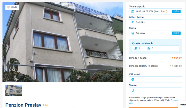 Jestliže byste rádi vyrazili k moři do Bulharska, zároveň však ušetřili nějakou tu korunu, využijte nabídky cestovní kanceláře za skvělých 6990 Kč. V této ceně máte zpáteční letenky z Pardubic, dopravu na místě, služby delegáta a ubytování v letovisku Nesebar. Inspiraci na výlety můžete načerpat v našem podrobném průvodci zdarma. Odlet je však již zítra, proto s rezervací neotálejte.