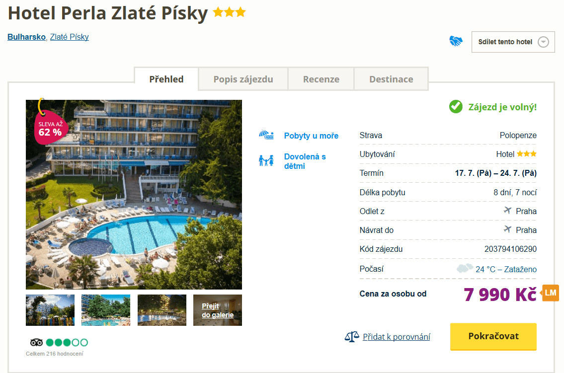 Hurá balit kufry! Jede se k moři, a to hned zítra! Využijte tedy akční nabídky cestovní kanceláře Čedok a již zítra si budete moct užívat pohody na slunných plážích Bulharska. V ceně 7990 Kč máte zahrnuty zpáteční letenky z Prahy, dopravu na místě, služby delegáta, ubytování a polopenzi na 8 dní. Podrobného průvodce po Bulharsku pak naleznete zde.