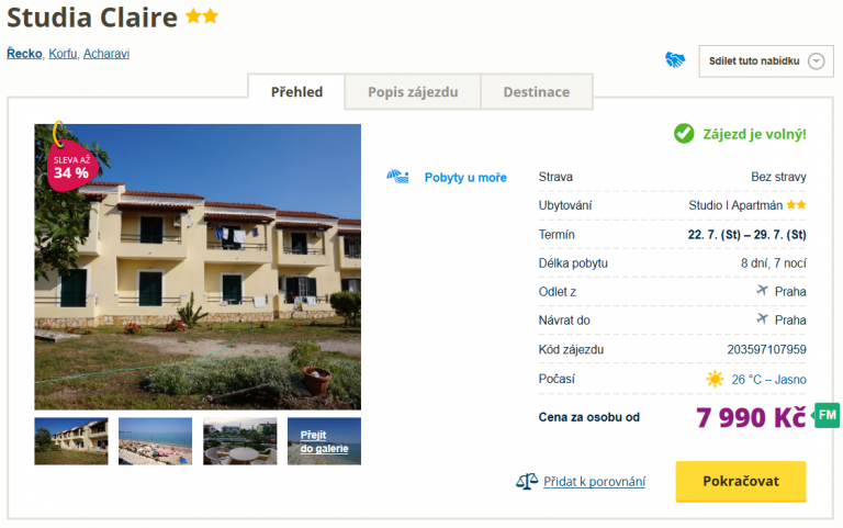 Že ještě nemáte sbaleno? Chyba! Protože již zítra se můžete slunit na vyhřátých písečných plážích krásného ostrova Korfu! Neváhejte tedy a využijte akční nabídky cestovní kanceláře, v jejíž ceně 7990 Kč máte zpáteční letenku z Prahy, dopravu na místě, služby delegáta a ubytování ve skvěle hodnoceném studiu. Podrobného průvodce po Korfu zcela zdarma pak naleznete zde.