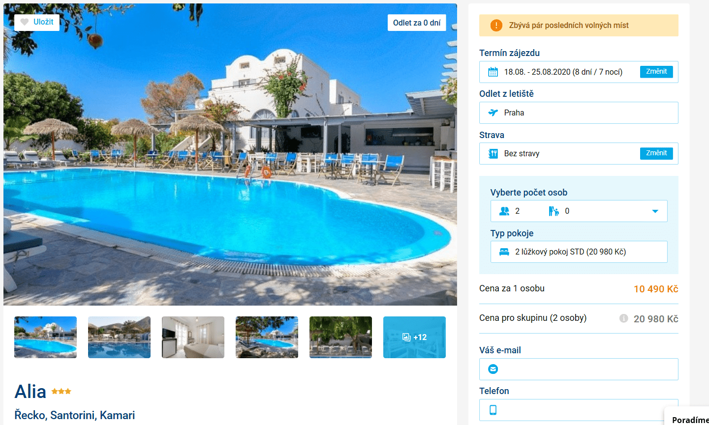 Máte rádi spontánní rozhodnutí a u moře si přejete být co nejdříve? Pak využijte akční nabídky cestovní kanceláře a již zítra odleťte na 8 dní na řecké Santorini. V ceně 10 490 Kč máte zpáteční letenku z Prahy, dopravu na místě, služby delegáta a ubytování se skvělým hodnocením! Inspiraci na výlety po Santorini naleznete v našem podrobném průvodci zdarma. Zbývají poslední místa, v případě zájmu s rezervací proto neotálejte.